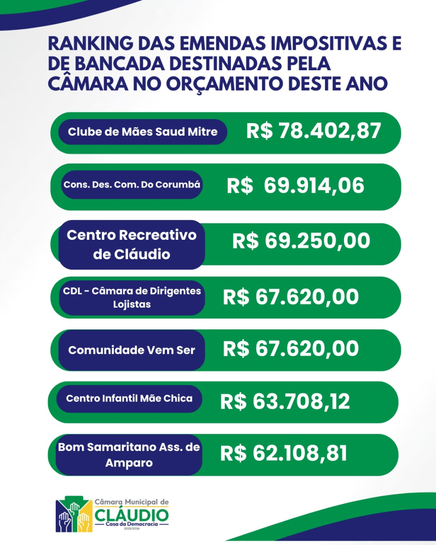 A Câmara Municipal de Cláudio consolidou o ranking das entidades contempladas pelas emendas impositivas individuais e de bancada que integram o orçamento de 2026.