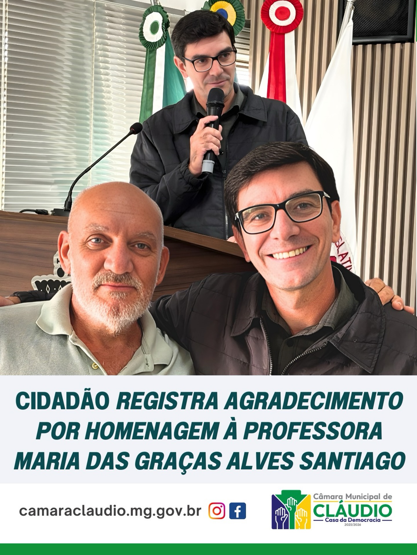 A última sessão extraordinária de 2025 da Câmara Municipal de Cláudio contou com o uso da Tribuna Livre pelo cidadão Alessandro Alves Santiago, que manifestou publicamente agradecimento pela alteração do nome do Centro Municipal de Educação Infantil do Bairro São Bento. A unidade passou a se chamar oficialmente “Cemei Professora Maria das Graças Alves Santiago”, por meio da Lei nº 1.860/2024.