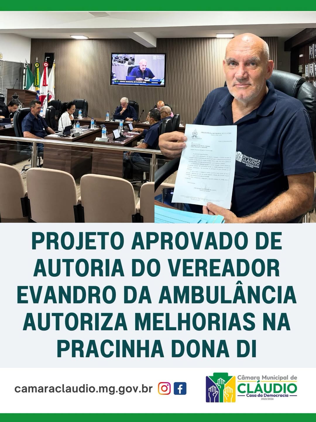 A Câmara Municipal de Cláudio aprovou, em dois turnos e redação final, o Projeto de Lei nº 01/2026, de autoria do vereador Evandro da Ambulância (PL), que autoriza o Município a realizar intervenções na “Pracinha Dona Di”, no Bairro Quinca Barão.