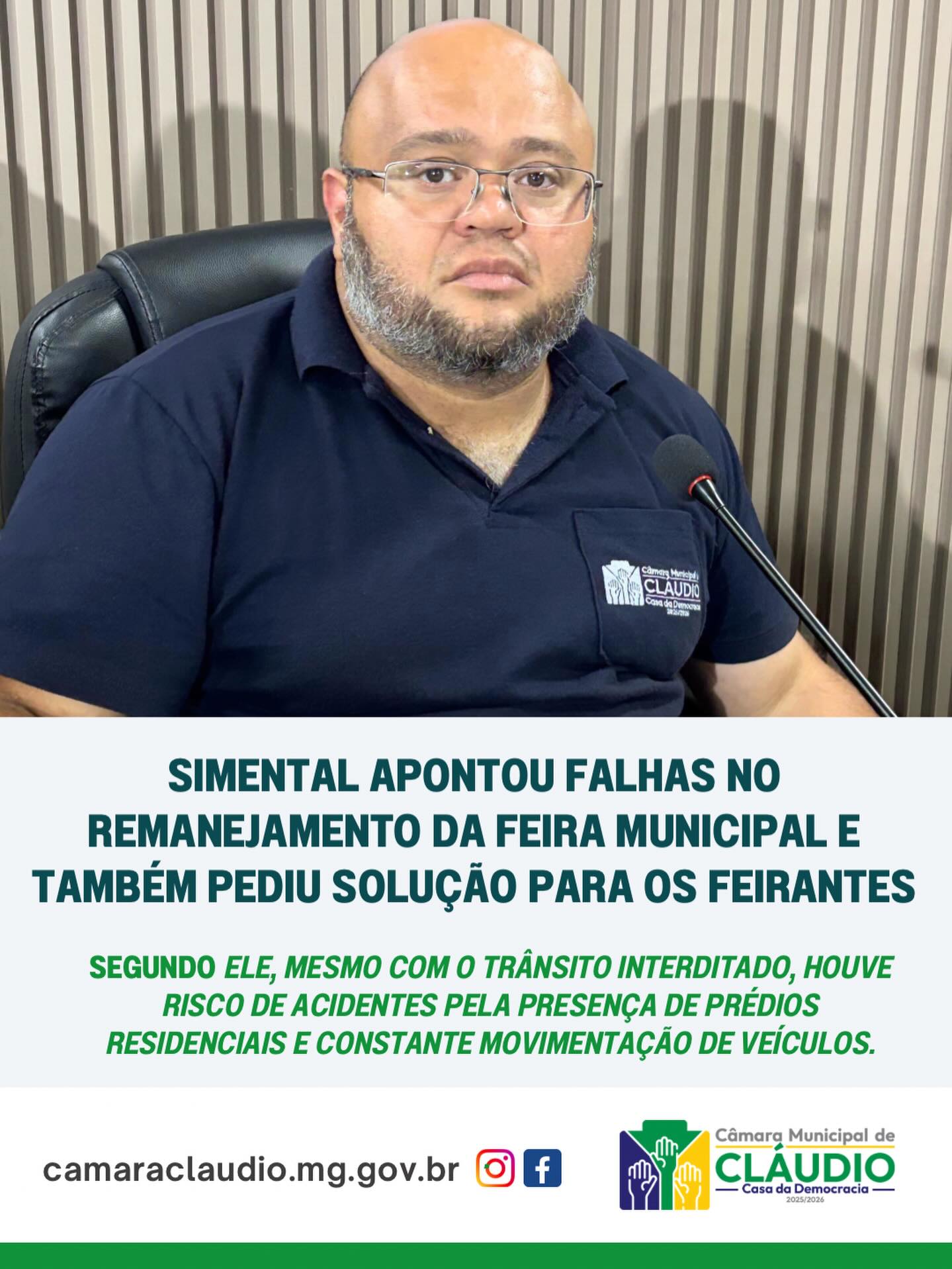 A Audiência Pública realizada pela Câmara Municipal de Cláudio para discutir a mudança de local da Feira Municipal contou também com manifestação do presidente da Câmara de Cláudio, vereador Simental, que ressaltou preocupações quanto à segurança, fluxo de veículos e impacto sobre os feirantes.