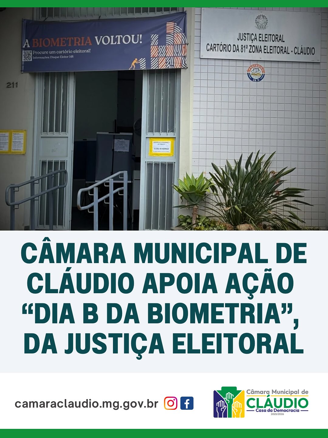 A Câmara Municipal de Cláudio reforça o apoio à Justiça Eleitoral na divulgação do “Dia B da Biometria”, que será realizado no dia 4 de outubro, no cartório da 81ª Zona Eleitoral, em Cláudio.