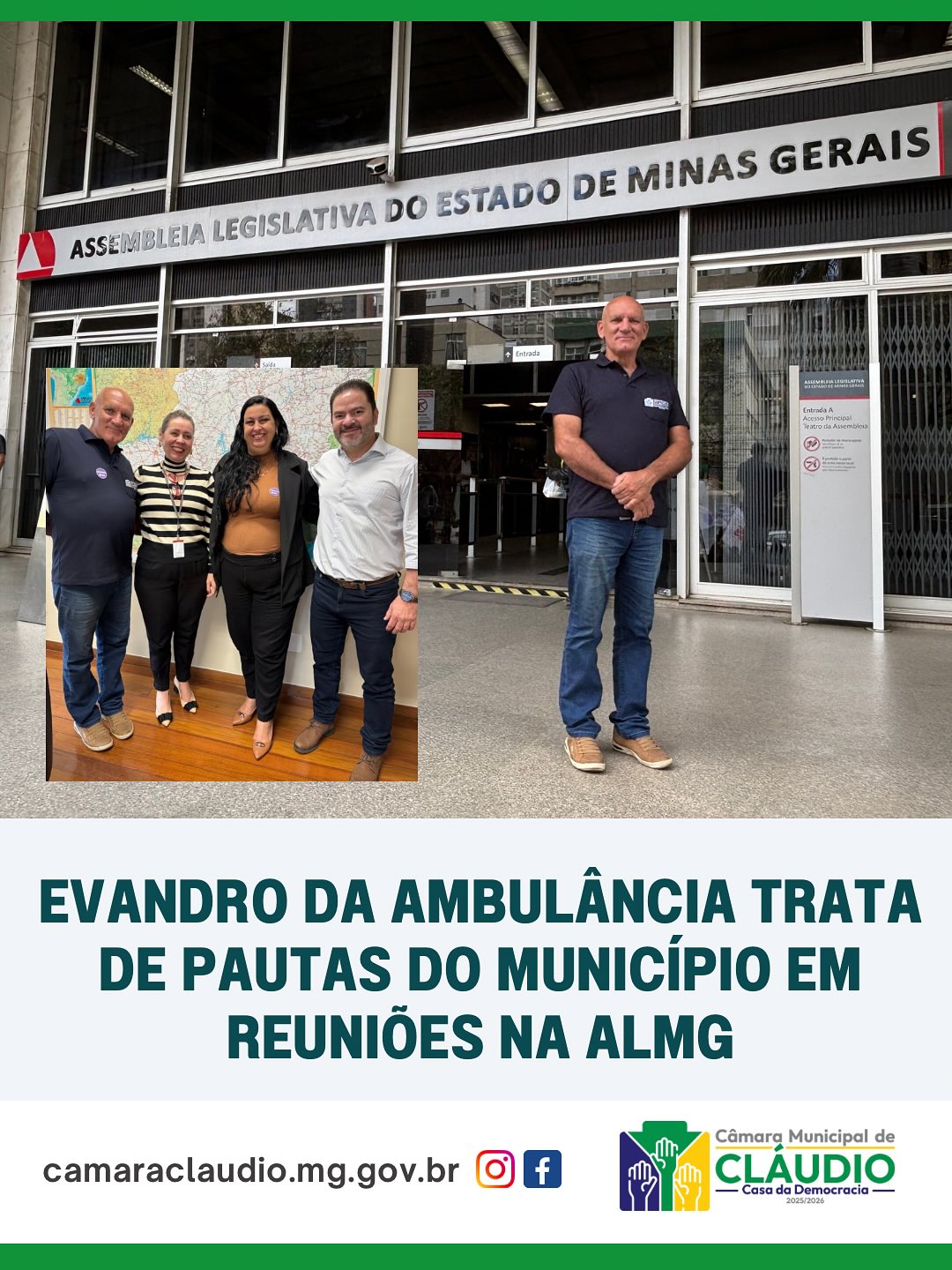 Em agenda na última quinta-feira, dia 25, o vereador Evandro da Ambulância esteve na Assembleia Legislativa de Minas Gerais (ALMG) para tratar de assuntos de interesse do município de Cláudio.