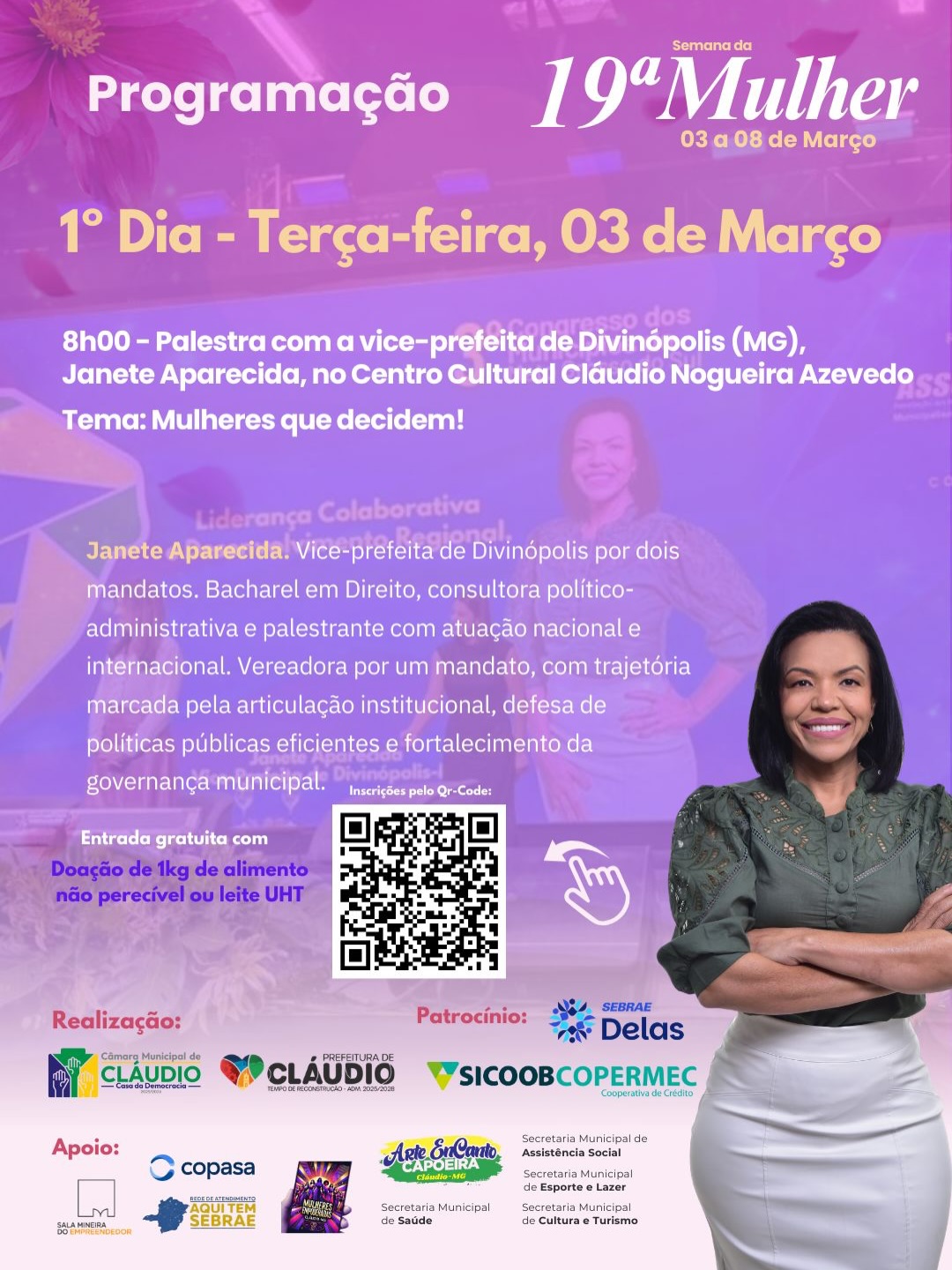 O primeiro dia da programação da 19ª Semana da Mulher, em Cláudio, terá na terça-feira (03), às 8h, a palestra “Mulheres que decidem!”, com a vice-prefeita de Divinópolis Janete Aparecida Silva. O evento acontece no Centro Cultural Cláudio Nogueira Azevedo.
