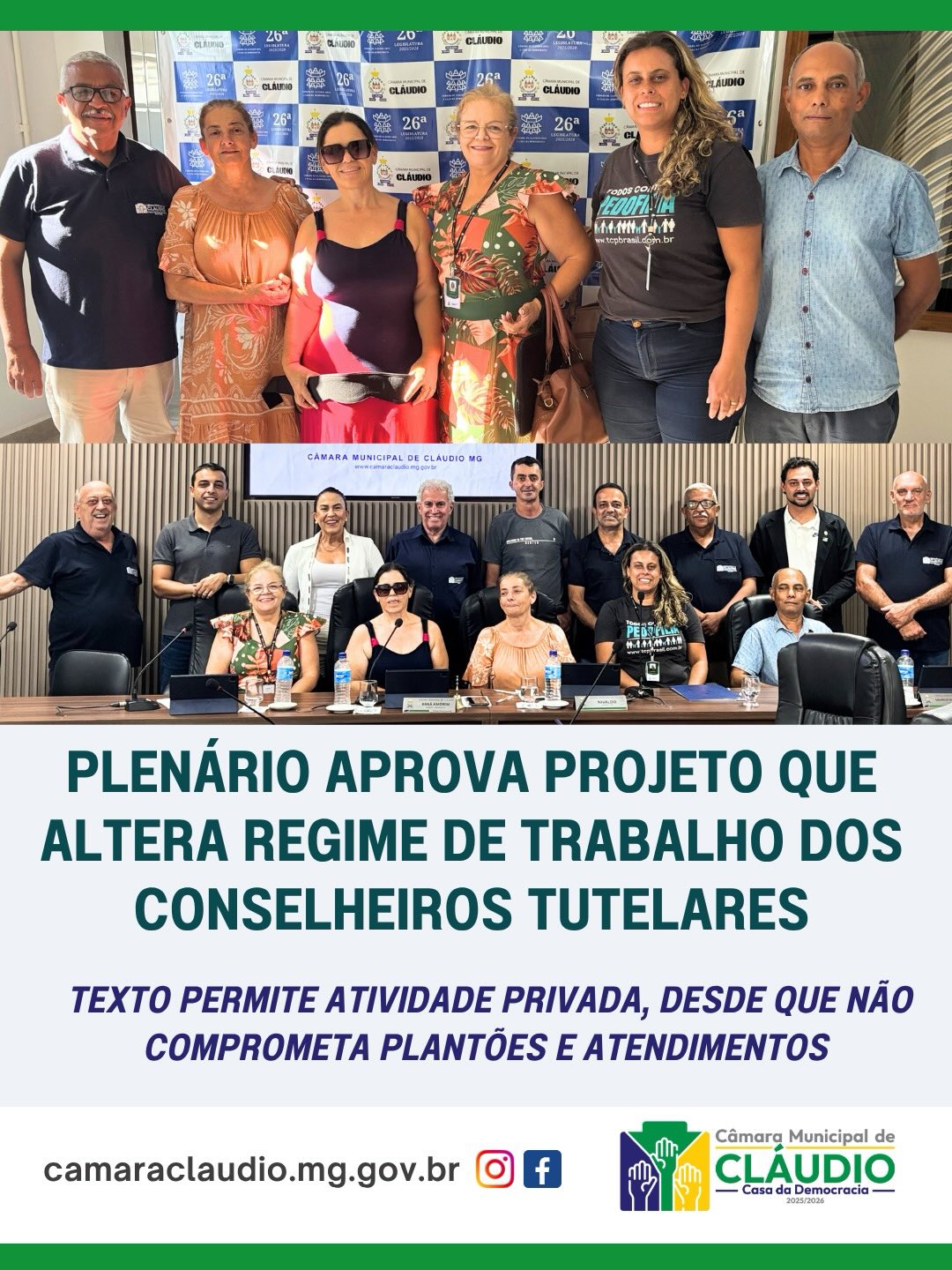 A Câmara Municipal de Cláudio aprovou, na sessão plenária de segunda (23), o Projeto de Lei nº 12/2026, que altera a legislação municipal para regulamentar o regime de trabalho dos membros do Conselho Tutelar. A matéria foi primeiro discutida nas comissões e, após requerimento de inclusão na pauta apresentado pelo vereador Geraldo Lázaro dos Santos, pôde ser votada no mesmo dia pelo plenário.