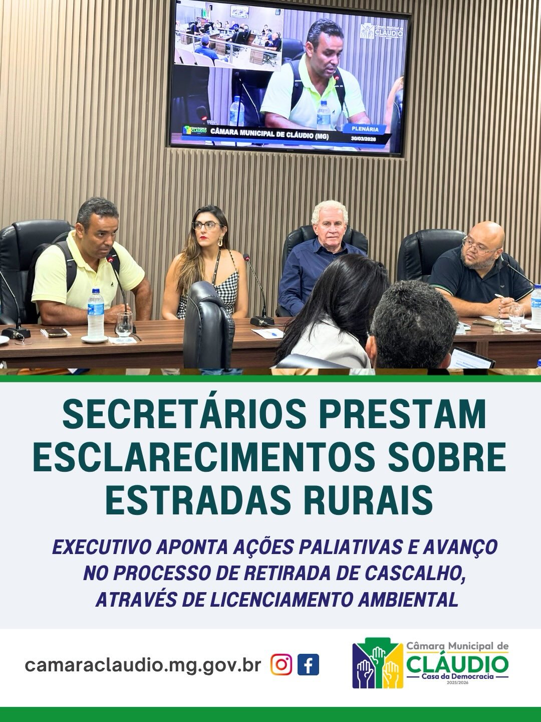 A Câmara Municipal de Cláudio recebeu, durante a sessão plenária de segunda-feira (30), o secretário municipal de Obras, Manoel Salomé, e a secretária de Meio Ambiente, Cristiane Bernardes Pereira, convocados para prestar esclarecimentos sobre a recuperação e manutenção de estradas rurais no município. O responsável pela manutenção das estradas, o servidor Sílvio Oliveira, acompanhou também as discussões através do espaço destinado ao público.