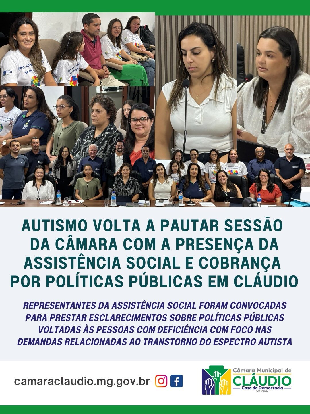 A Câmara Municipal de Cláudio realizou, nesta semana, sessão plenária com a presença de representantes da assistência social do município, convocadas para prestar esclarecimentos sobre políticas públicas voltadas às pessoas com deficiência com destaque também nas demandas relacionadas ao transtorno do espectro autista (TEA).