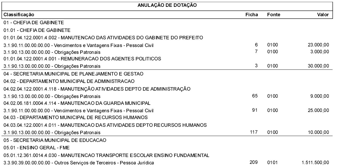 Art. 2º Como fonte dos recursos financeiros destinados à abertura do crédito adicional suplementar, reportado no artigo anterior, anular-se-á parte das seguintes dotação orçamentárias: