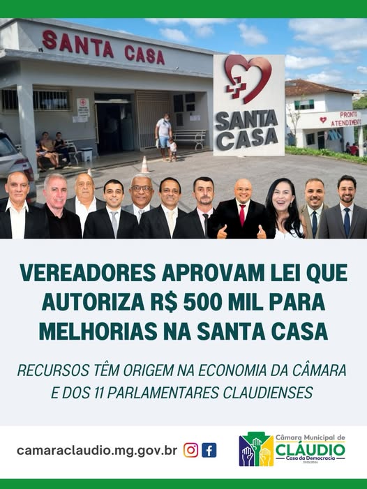 A Câmara Municipal de Cláudio aprovou na segunda (09) o projeto de lei 06/2026, do Poder Executivo, que autoriza o repasse de R$ 500.000,00 à Santa Casa de Misericórdia de Cláudio com destinação para obras de manutenção e infraestrutura, conforme plano de trabalho a ser pactuado com a instituição. A matéria tramitou nas comissões permanentes e foi apreciada em plenário após requerimento de inserção em pauta.