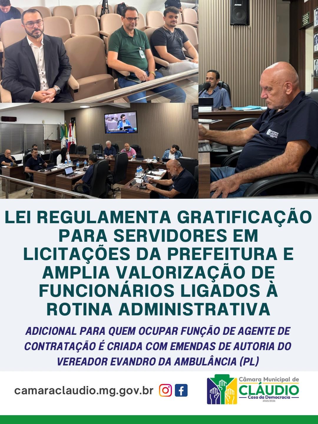 Entrou em vigor a Lei Complementar nº 214, de 16 de abril de 2026, que institui a gratificação pelo exercício das funções de agente de contratação e pregoeiro no âmbito do Poder Executivo de Cláudio. A proposta, de autoria do prefeito Zezinho, foi aprovada pela Câmara Municipal com duas emendas apresentadas pelo vereador Evandro da Ambulância (PL), que valorizam e prestigiam a gratificação para servidores de áreas administrativas.