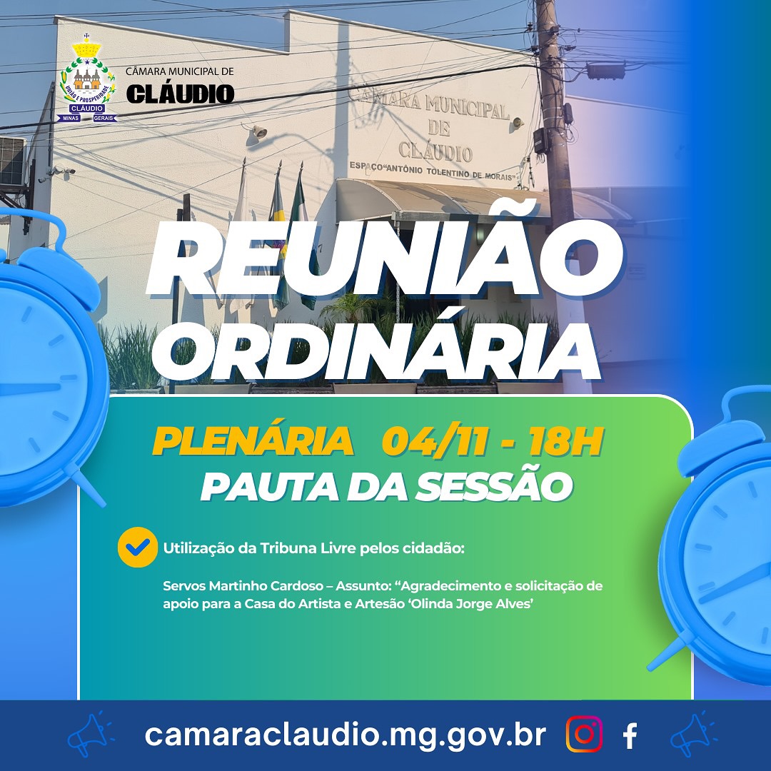 Nesta segunda-feira (04), a Câmara Municipal realiza duas sessões ordinárias, sendo a reunião das Comissões Permanentes, às 14h, e a reunião Plenária, às 18h.