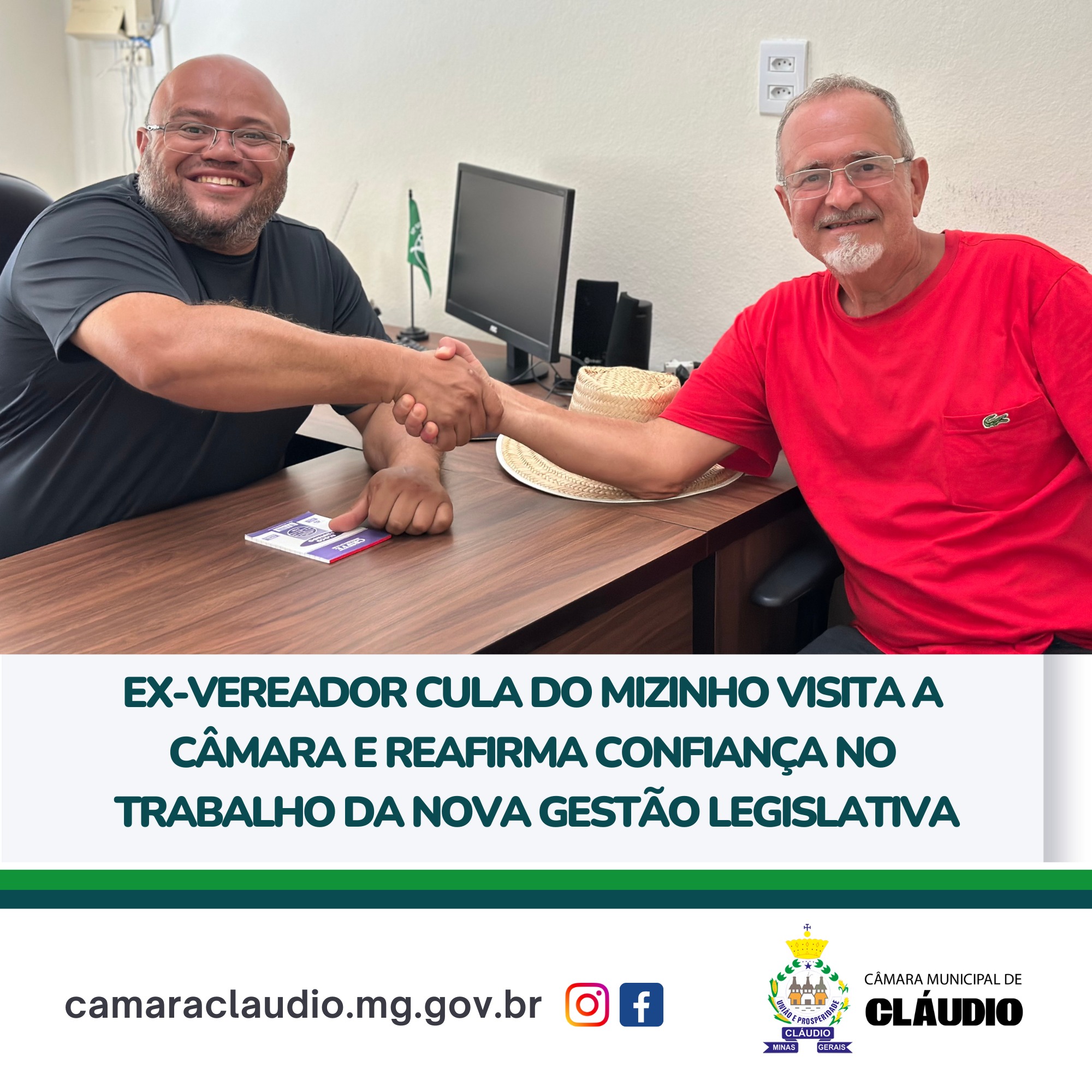O ex-vereador do município de Cláudio (MG), Clodomir de Barros Filho, o Cula do Mizinho, esteve em visita nesta segunda-feira (13) às dependências internas da Câmara, ocasião em que foi recebido pelo Chefe do Poder Legislativo, o presidente Simental.