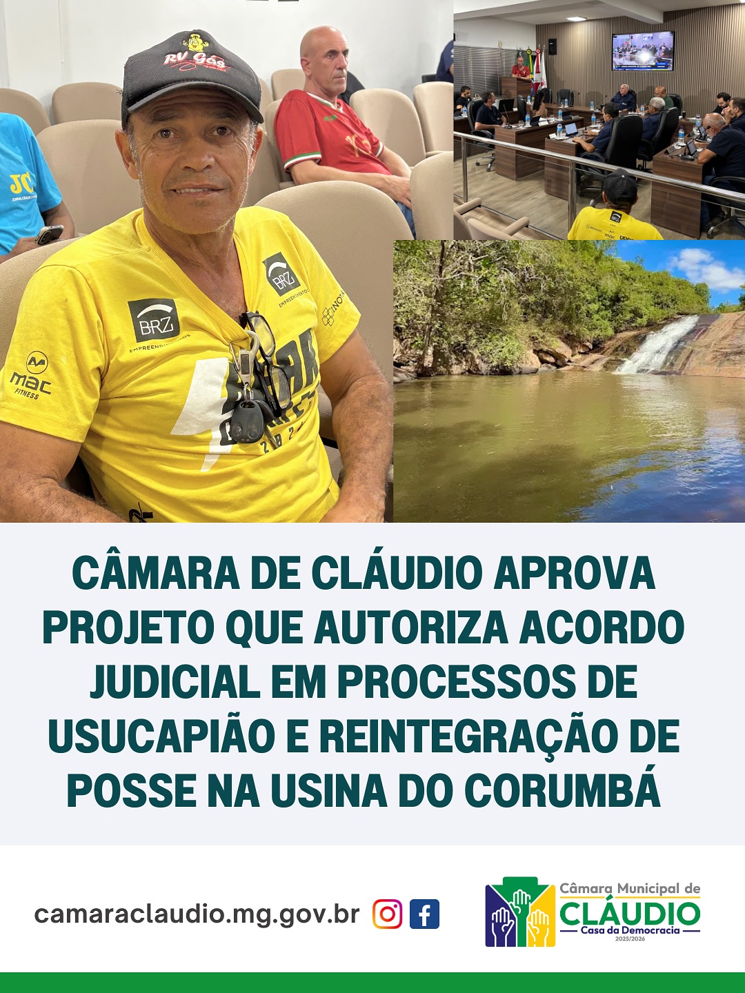 A Câmara Municipal de Cláudio aprovou em dois turnos com redação final, nesta semana, o Projeto de Lei nº 17/2025, de autoria do Executivo, que autoriza a celebração de acordo judicial com Sebastião Ananias Teixeira em dois processos que tramitam na Justiça: uma ação de usucapião e uma ação de reintegração de posse. A proposta segue agora para sanção do prefeito José Rodrigues Barroso de Araújo.