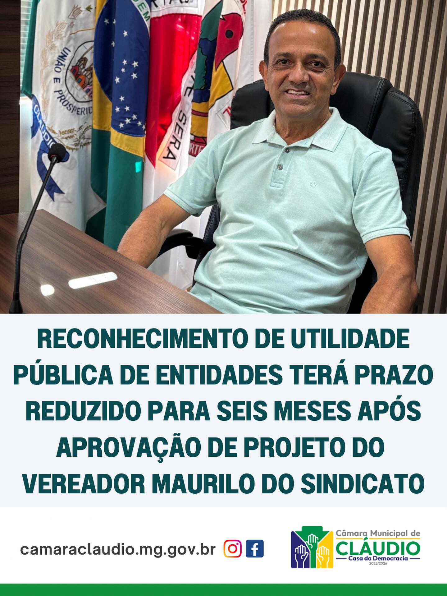 A Câmara Municipal de Cláudio aprovou, por unanimidade, o Projeto de Lei nº 31/2025, de autoria do vereador Maurilo do Sindicato (PL), que reduz de um ano para seis meses o prazo mínimo de funcionamento exigido para que entidades sediadas no município possam pleitear o reconhecimento de Utilidade Pública. O texto segue para sanção do Executivo.