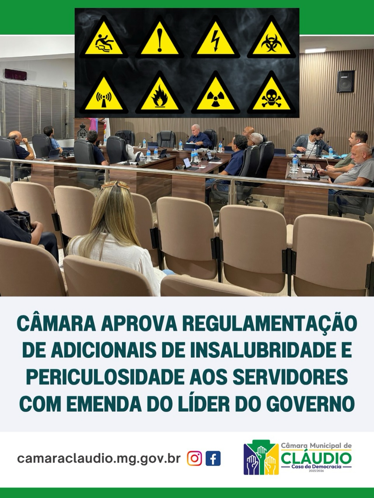 O plenário da Câmara Municipal de Cláudio aprovou, em dois turnos e redação final, o Projeto de Lei Complementar nº 13/2025, que disciplina a concessão do adicional de insalubridade e do adicional de periculosidade aos servidores públicos do município.