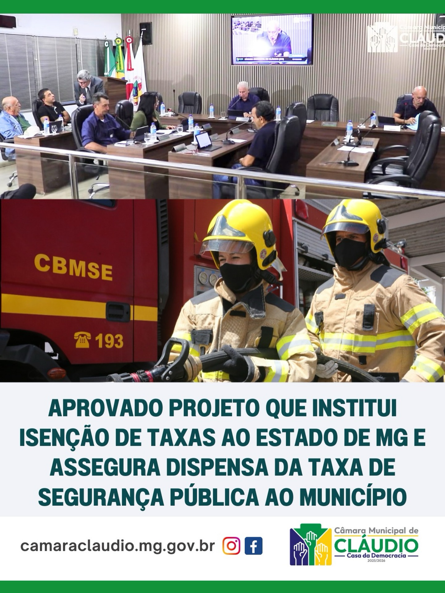 A Câmara Municipal de Cláudio aprovou por seis votos, em dois turnos e redação final, durante sessão extraordinária realizada na última quarta-feira (10), o Projeto de Lei 47/2025, de autoria do Poder Executivo, que “dispõe sobre a isenção de taxas ao Estado de Minas Gerais e dá outras providências”.