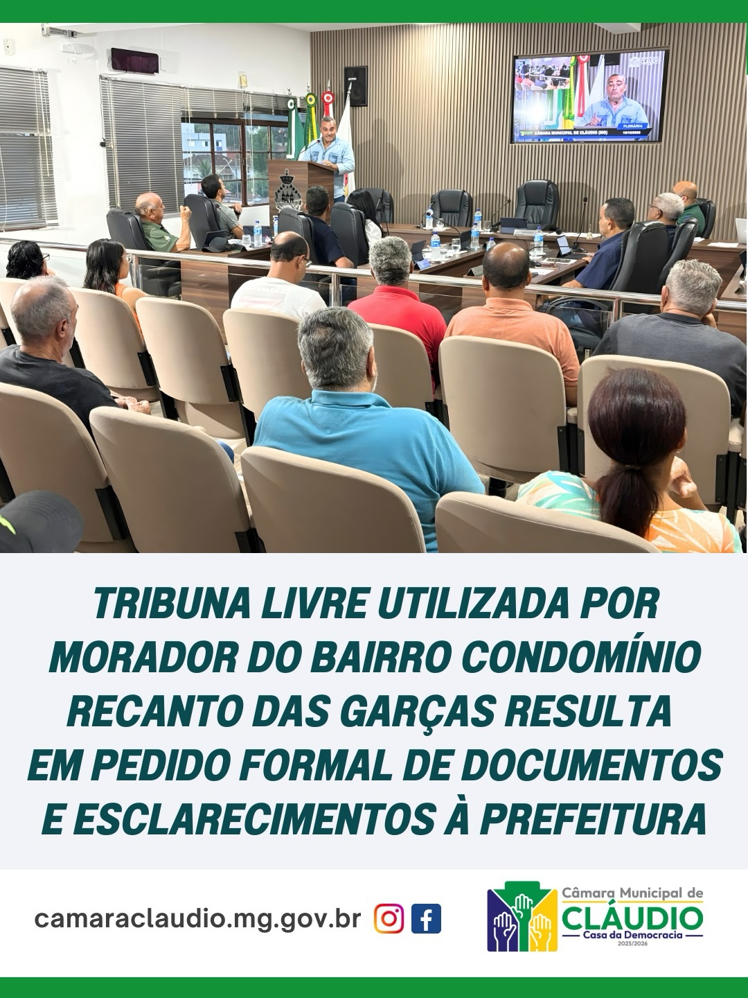 Moradores do Balneário Recanto das Garças lotaram o plenário da Câmara Municipal de Cláudio na penúltima sessão plenária de 2025 para acompanhar o uso da Tribuna Livre pelo morador José Ricardo de Andrade. Ele levou aos vereadores uma série de reclamações sobre infraestrutura, serviços públicos e a condução das obras na orla do chamado “Novo Mar de Minas”.