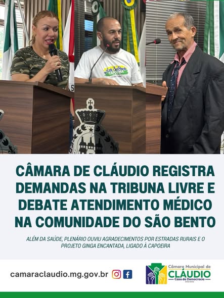 A Câmara Municipal de Cláudio registrou a participação de moradores duas primeiras reuniões plenárias deste ano com uso da Tribuna Livre em uma sessão extraordinária e em uma sessão ordinária. As falas abordaram melhorias em estradas rurais, saúde pública e iniciativas sociais desenvolvidas no município.