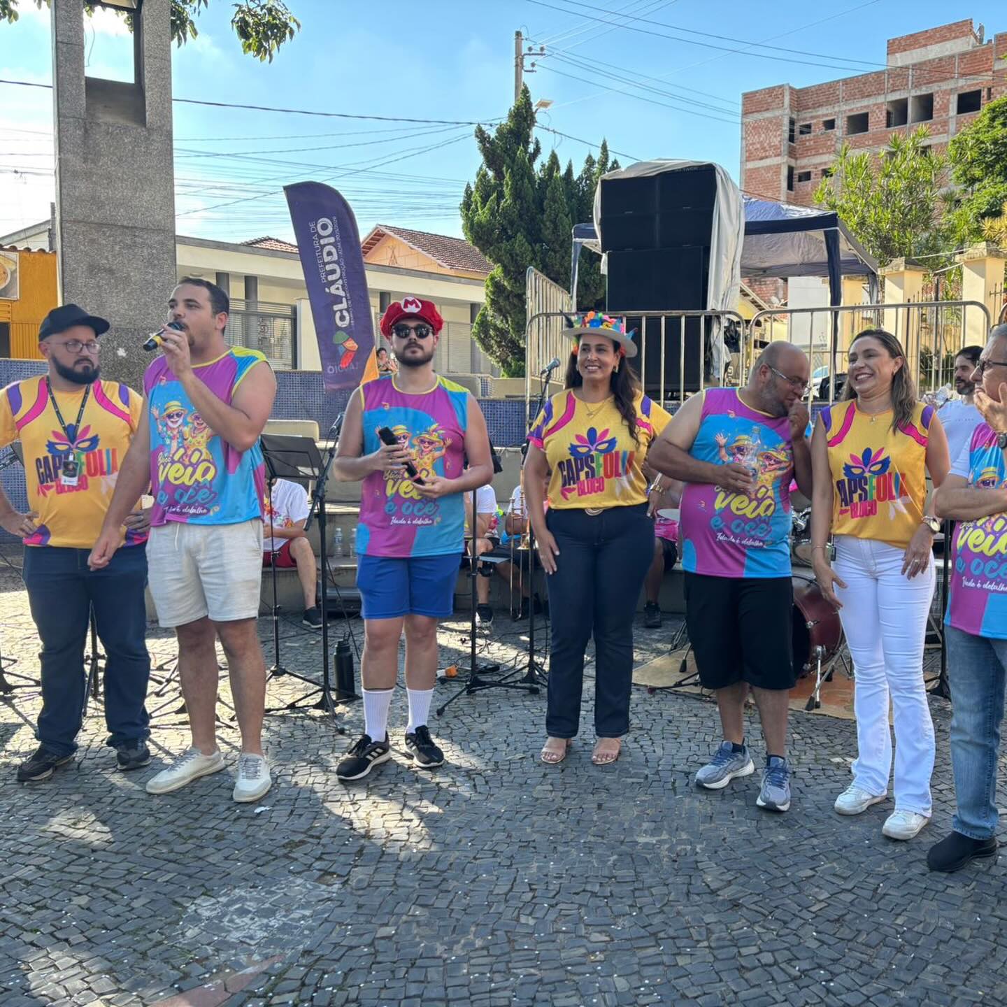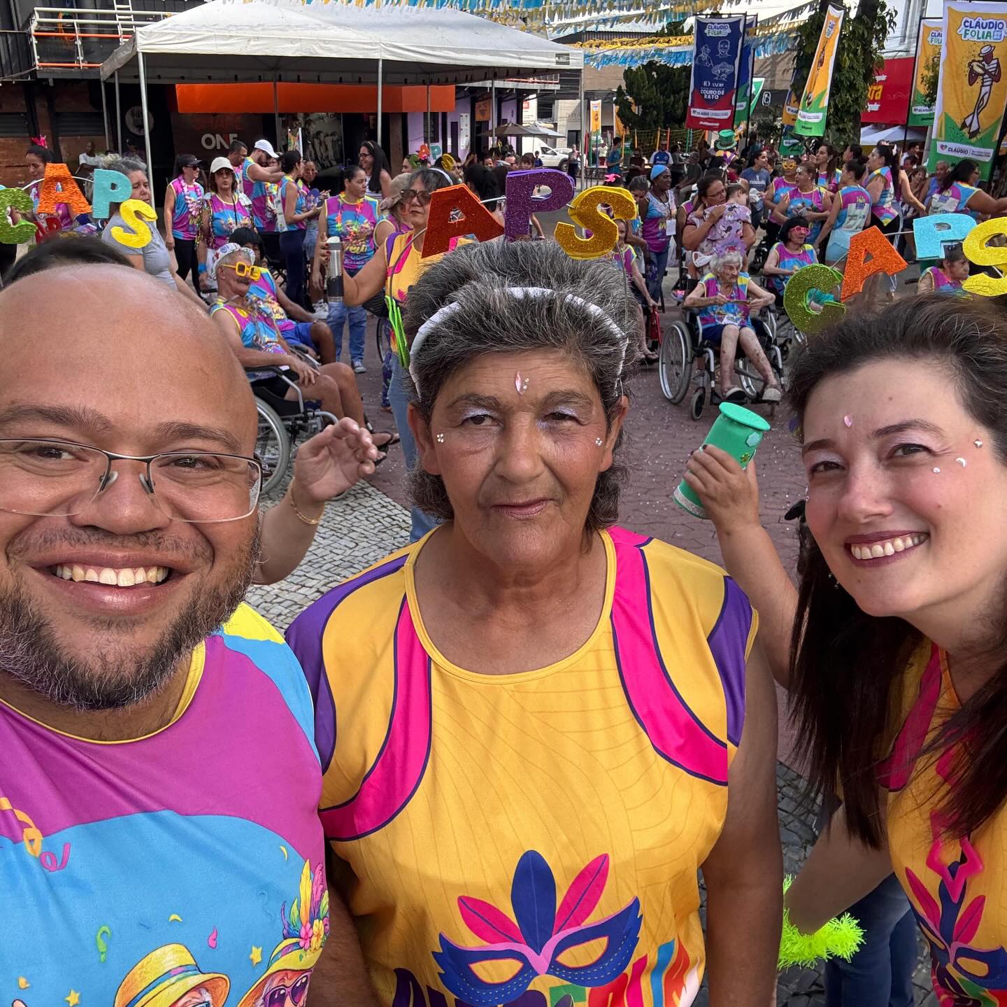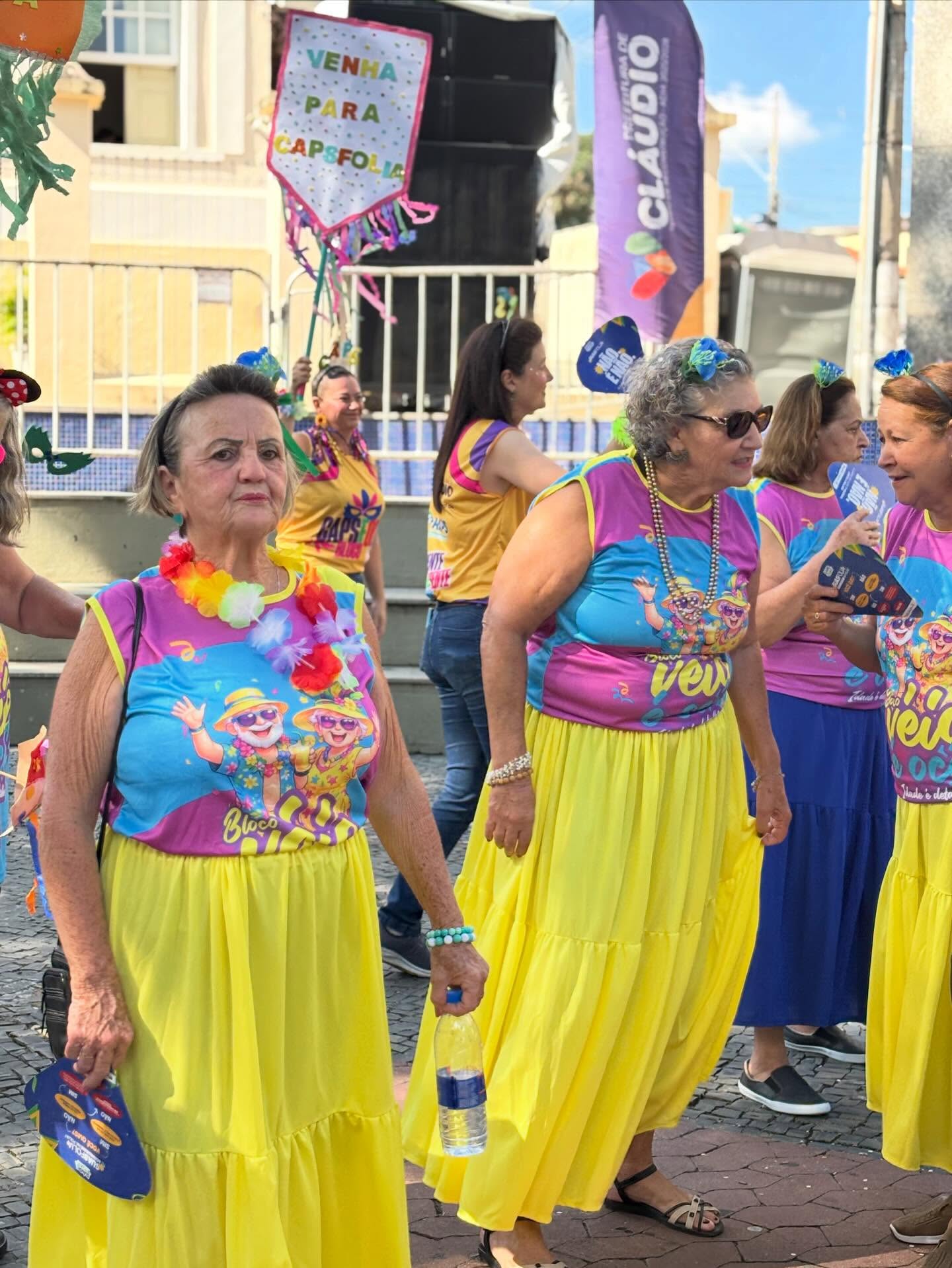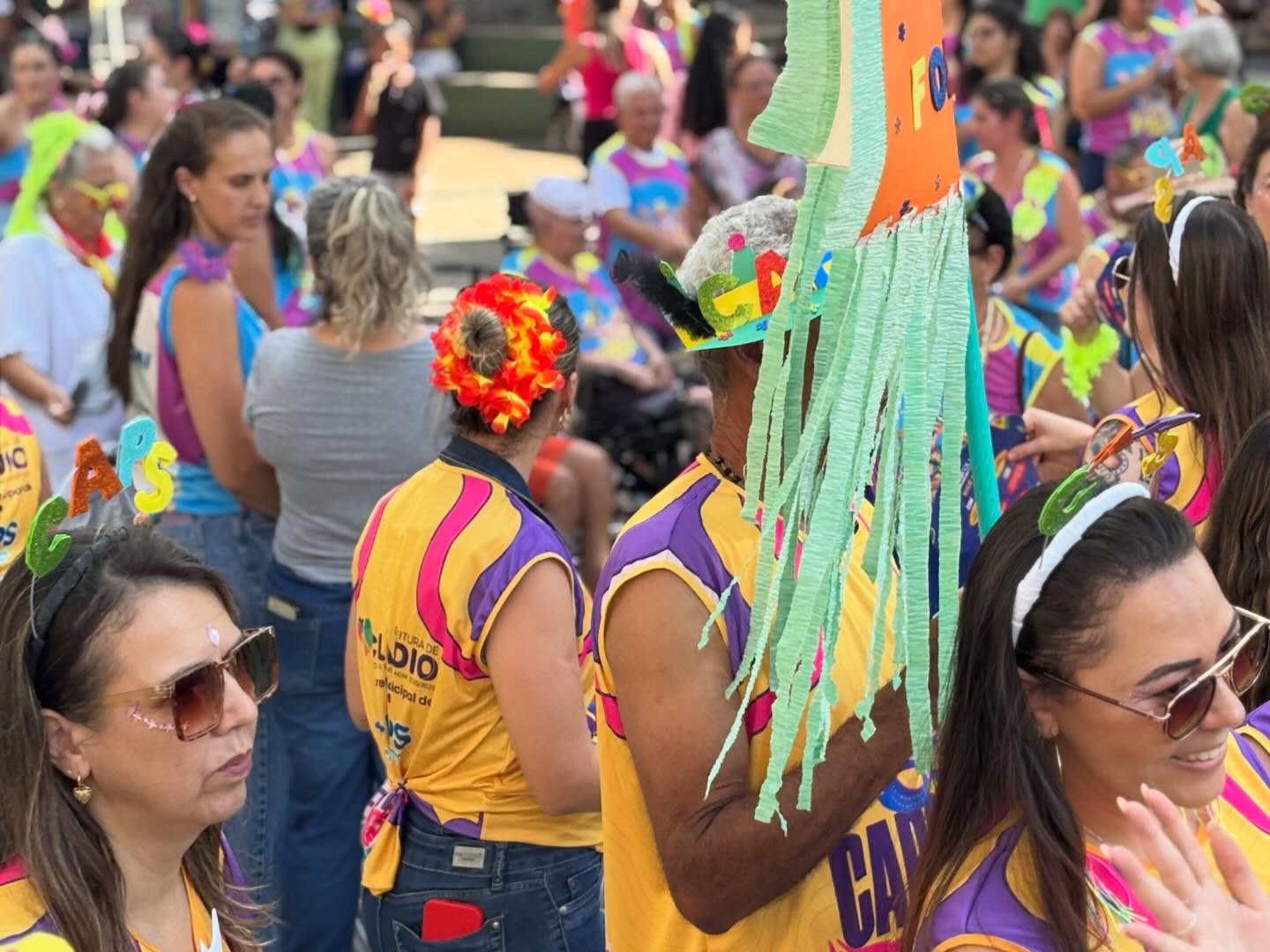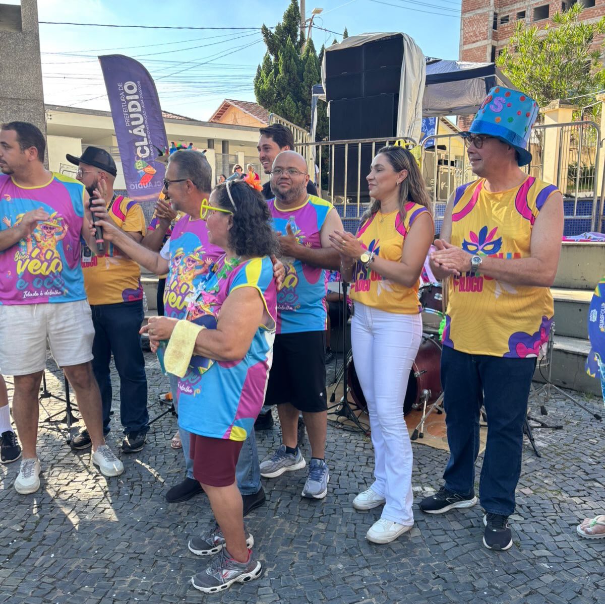 Na tarde desta quinta-feira (12), a CláudioFolia ganhou um momento especial com o Bloco Véio é Ocê, reunindo os idosos dos Lares Bom Pastor, Bom Samaritano e Santo Antônio, além do bloco do CAPS, que levou animação e até carro alegórico para a Pracinha do Clube (Levy Vitói de Freitas).