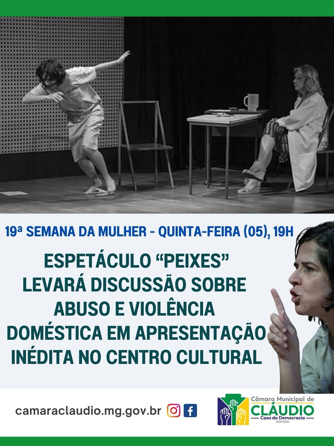 O espetáculo “Peixes” acontecerá durante este terceiro dia da Semana da Mulher e tem apresentação prevista para a noite desta quinta-feira (05), no Centro Cultural Cláudio Nogueira Azevedo, com entrada a partir de 14 anos. A agenda cultural é organizada pela Câmara Municipal de Cláudio e pela Prefeitura de Cláudio, com participação de parceiros.