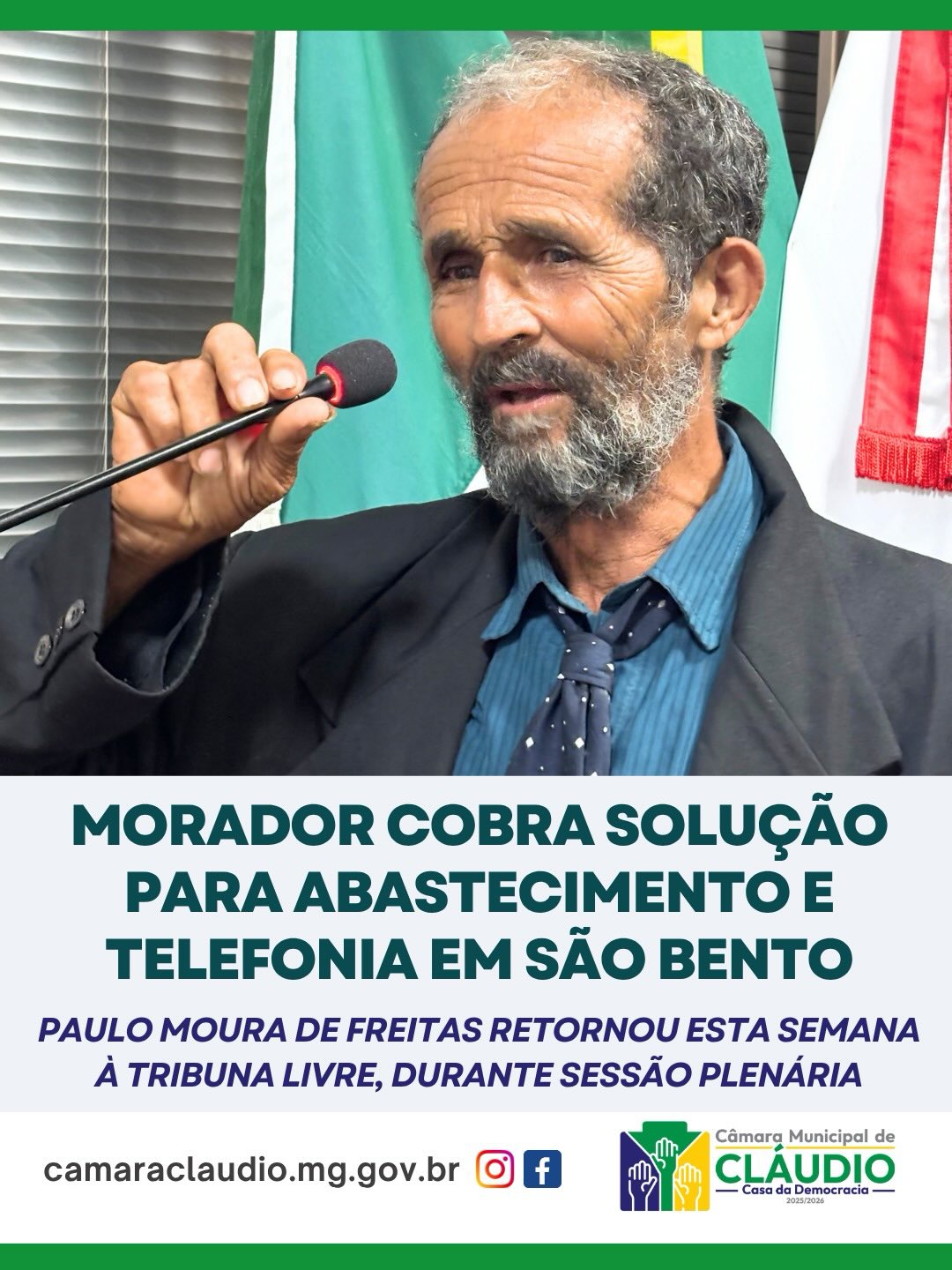 A Câmara Municipal de Cláudio voltou a receber, neste ano, a participação do cidadão Paulo Moura de Freitas, por meio da Tribuna Livre. Na reunião realizada na segunda-feira (27), ele utilizou o espaço para apresentar demandas relacionadas à comunidade de São Bento, na zona rural do município.